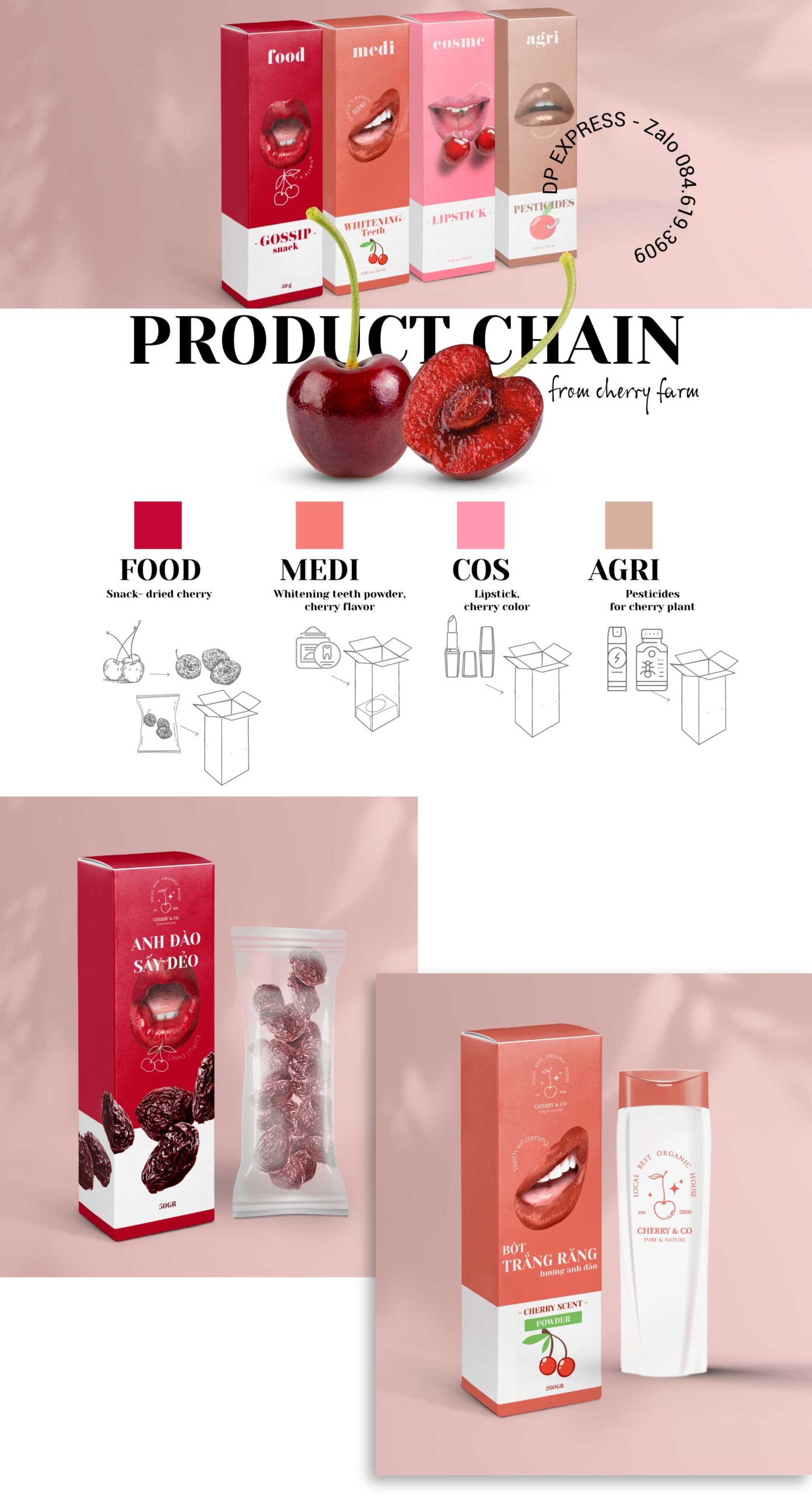 Cùng 1 nguyên liệu trái anh đào, sản xuất chuỗi sản phẩm: Ăn vặt (trái cây sấy), Dược mỹ phẩm (Bột tẩy trắng răng), Mỹ phẩm (son môi), Hóa phẩm (Thuốc diệt côn trùng cây anh đào)